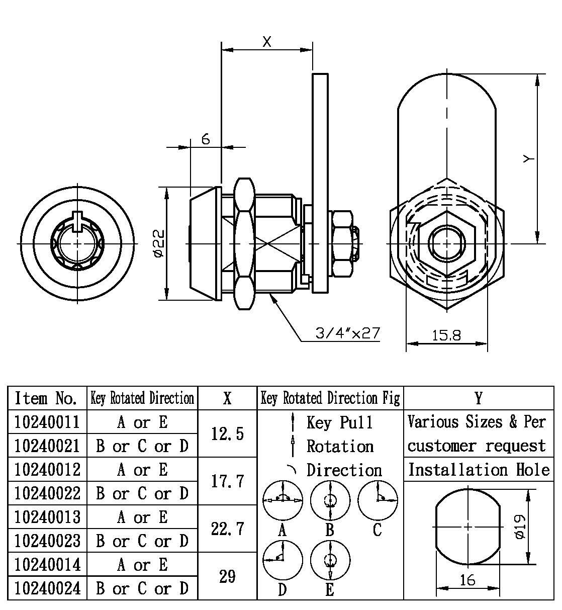 1、锁心外牙采螺帽固定、锁心内牙采螺丝固定,铜或锌合金锁壳与锁心