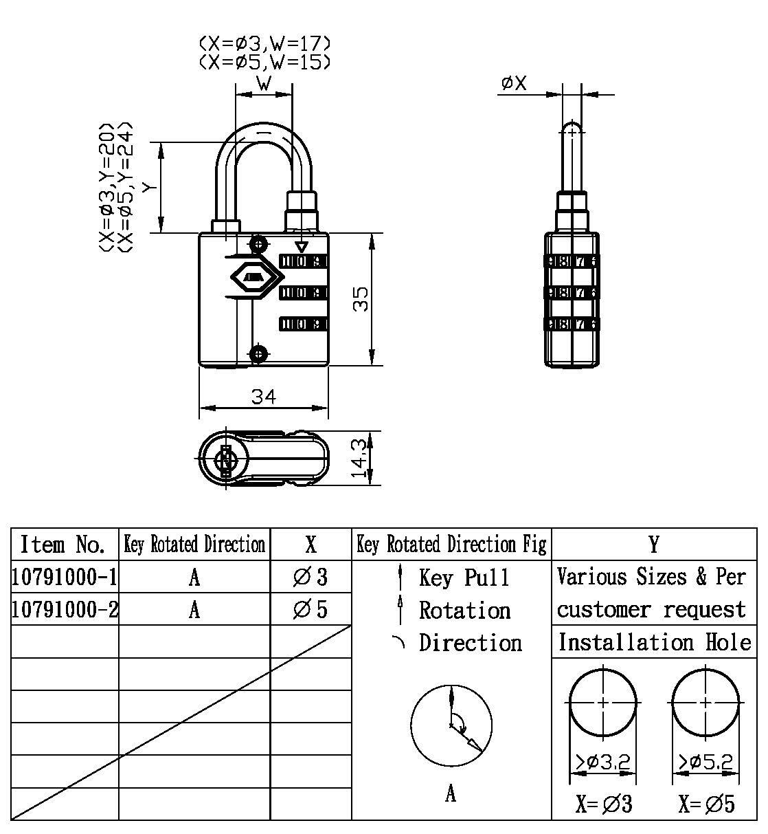3. 锌合金外壳及锁心,锁勾有直径3mm及5mm两款